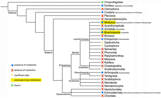 Schematic view of the distribution of mytilectins across the metazoan tree of life. Presence or absence is displayed at the phylum level, with further indication of their distribution at lower taxonomic ranks, whenever relevant. In this representation, presence indicates that some (but not all) the members of a given phylum had mytilectin genes, whereas absence indicates that no mytilecin sequences could be detected in any of the genomes or transcriptomes available for a given phylum. In a few cases, evidenced with a question mark, available genomic data was insufficient to draw definitive conclusions concerning the presence or absence of mytilectins. The phylogenetic placement of the phylum Choanoflagellata at the base of the tree is marked due to the detection of SaroL-1, a lectin sharing striking structural similarity with mytilectins, as discussed in Section 2.6.
