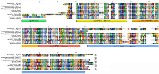 We had previously described the presence of two distinct types of mytilectins [88], defined as “proto-type” and “chimera-type”, respectively, characterized by markedly different length and domain architecture. Proto-type mytilectins, which include all functionally characterized mytilectins to date (i.e., CGL, MTL and MytiLec-1), display a single β-trefoil CRD with no accessory domains, being approximately 150 aa long. On the other hand, other mytilectins identified in M. galloprovincialis and L. anatina were significantly longer due to the presence of a C-terminal extension encoding an additional 140 aa-long domain, whose three-dimensional structure was predicted to resemble that of Aeromomas hydrophyla aerolysin and other pore-forming toxins [34,89]. The presence of these two distinct domain architectures leaves an open question concerning the ancestral structural configuration of mytilectins, due to the existence of two alternative evolutionary scenarios: indeed, the CRD/pore-forming domain combination observed in chimera-type mytilectins could be the result of a gene fusion event involving an ancestral proto-type mytilectin gene, or, alternatively, proto-type mytilectins could be the result of the secondary loss of the pore-forming domain present in the ancestral chimera-type gene. To provide an answer to this question, we collected over one hundred mytilectin sequences from multiple phyla, significantly expanding the repertoire of both mytilectin types. The multiple sequence alignment displayed in Figure 2 reports a representative group of the mytilectins recovered in this study.