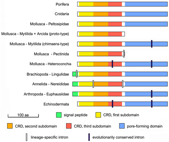 Additional independent lineage-specific intron gain events could be inferred in nereidid polychaetes, which displayed two introns, placed roughly between the first and the second CRD subdomains, and in the region connecting the CRD to the pore-forming domain, respectively, and in Brachiopoda, where the ORF was interrupted close to the N-terminal end. Interestingly, the placement of this intron may explain the acquisition of a signal peptide by brachiopod mytilectins, perhaps due to exon shuffling phenomena (see Section 2.2).