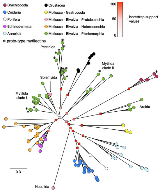Maximum likelihood phylogeny of mytilectins, represented as an unrooted tree. Individual sequences are displayed as circles, colored based on the major taxonomic groups discussed in the main text (i.e., Brachiopoda, Cnidaria, Porifera, Echinodermata, Crustacea, and Mollusca, further subdivided among Gastropoda and three taxonomic groups of Bivalvia, i.e., Protobranchia, Heteroconchia, and Pteriomorphia). Further lower-rank classifications discussed in the main text are also indicated close to the relevant clades. For the sake of simplicity, statistical support for major basal nodes is reported with squares, whose color indicates bootstrap values. Proto-type mytilectins are marked with an asterisk.