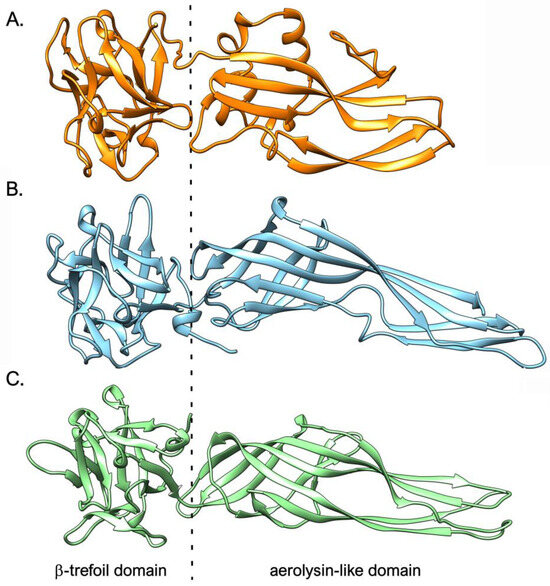 2.6. On the Occurrence of the β-Trefoil/Aerolysin-like Pore-Forming Domain Combination in Non-Metazoan Phyla: Convergent Evolution or Shared Ancestry?