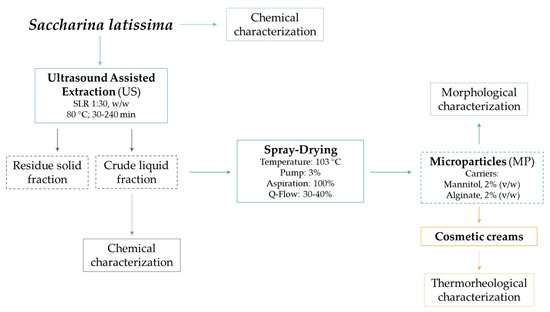 In the current work, the extraction technology used to obtain bioactive fractions was ultrasound-assisted extraction; Figure 1 shows the flow diagram of the extraction process carried out and the operating conditions, using S. latissima as the raw material, resulting in the formulation of cosmetics with polymeric particulate systems as microparticles.