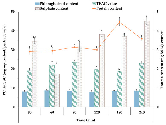 Total phloroglucinol content (PC), antioxidant activity in terms of TEAC values (AC), sulphate content (SC) and protein content for extracts from S. latissima processed under different durations of ultrasound (from 30 to 240 min). Note: n ≥ 3, letters in columns represent significant differences (p > 0.95).