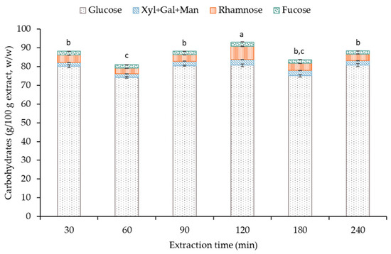 Carbohydrates content for extracts from S. latissima processed under different ultrasound (US) time conditions (from 30 to 240 min). Note: n ≥ 3, letters in columns represent significant differences (p > 0.95).