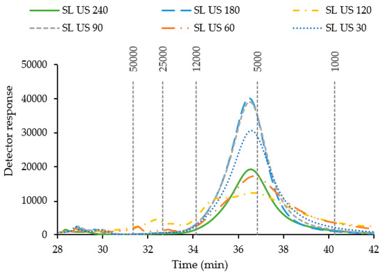 Molecular mass distribution for extracts from S. latissima (SL), processed under different ultrasound (US) time conditions (from 30 to 240 min). In the vertical lines are the values of the patterns, namely of dextran, from 1000 to 50,000 Da.