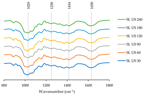 FTIR spectra for extracts from S. latissima (SL) obtained by ultrasound-assisted extraction (US) at different time conditions (from 30 to 240 min).