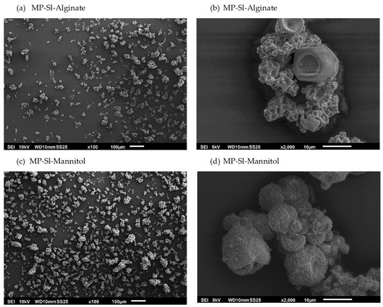 SEM images of the polymeric microparticles (MP) formulated with the extract obtained from S. latissima (SL) and two polymers: alginate (a,b) and mannitol (c,d), at different magnitudes (×100 and ×2000).