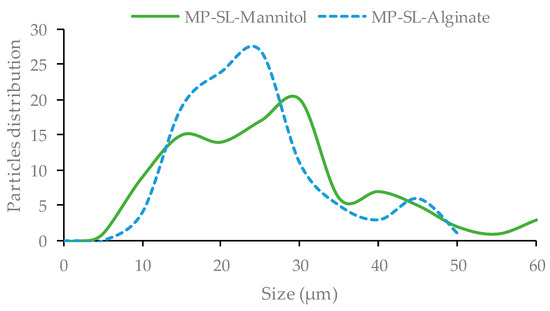 Another parameter analyzed to evaluate the particles was the size profile of the microparticles formulated with the extract of S. latissima and the polymers (alginate and mannitol), shown in Figure 7. Differences associated with the polymer used were found. The microparticles formulated with mannitol exhibited a size between 20 and 25 µm, whereas the microparticles formulated with alginate showed two bands, around 15 µm and around 30 µm. This is a clear effect of the polymer used in the formulation, and both could display different behaviors in biomedical applications, for example with cell lines. An effect due to size differences could also probably be observed.