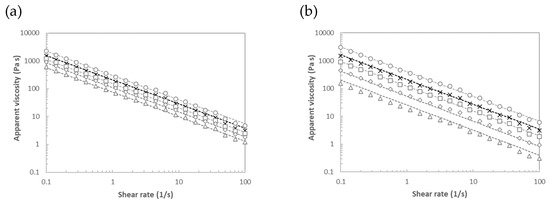 where n (−) is the flow index and k′ (Pa sn) represents the flow consistency index. The flow index was practically invariant (between 0.10 and 0.13), which was consistent with those previously reported for biopolymer-based shear thinning systems [61].