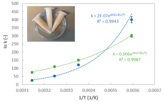 It should be highlighted that the k parameter increased with a decreasing temperature, exhibiting an Arrhenius behavior within the tested temperature range (Figure 9). This is consistent with the tendencies featured for other polymeric matrices, such as those formulated with guar or tragacanth gums at similar temperature ranges [61].