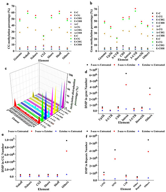 Ectoine hypomethylated DNA in skin cells. Global DNA methylation analysis in HaCaT cells treated with ectoine compared to that in cells treated with 5-aza and untreated cells subjected to global methylation sequencing. Gene methylation analysis was performed using the methylated C region and was determined from the comparison results of BisMark using a binomial distribution test. DMPs and DMR were analyzed using Bioconductor package DSS. The data show the methylation level of DNA at the CGI level (a), gene element methylation level (b), and total methylation distribution level (c). The DMPs’ analysis showed that the number of HaCaT DMPs in the CG elements (d) was similar to the number of DMPs (e) and repeats (f).