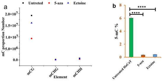 To validate global DNA methylation, in vitro, we analyzed the percentage of methylation-targeted 5mC in the DNA using 5mC specific antibodies and in silico analysis for the mCG, mCHH and mCHG sequence contexts proportion from the whole-genome bisulfate sequences. Bioinformatic analysis of the methylome showed that the proportion of mC was significantly lower in ectoine-treated cells than in untreated cells, while it was the lowest in 5-aza-treated cells (Figure 2a). Antibodies targeting 5mC showed that ectoine significantly hypomethylated DNA compared to untreated cells (Figure 2b). However, 5-aza-treated cells showed marked hypomethylation. Therefore, ectoine reduced the DNA 5mC level throughout the whole DNA in skin cells.