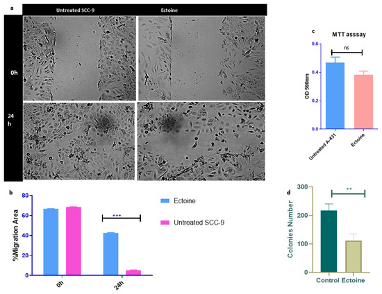 Effects of ectoine on skin cell proliferation. Wound healing assay was employed to determine the migration of SSC cells treated with ectoine and control visualized under bright field microscopy after 0 h and 24 h (*** p < 0.001) (a), and the migration areas were analyzed using ImageJ software, presented and statistically analyzed using GraphPad prism 8.0.2 and t-test (b). MTT assay to SCC cells treated with ectoine and untreated control for 48 h and visualized by plate reader after 48 h (c). (ns denotes p > 0.05). Clonogenic assay for HaCaT cells. The cells were seeded at 100 cells/mL and treated with ectoine, and formed colonies were counted after 9 days, presented, and statistically analyzed using GraphPad prism and t-test (** p < 0.01) (d).