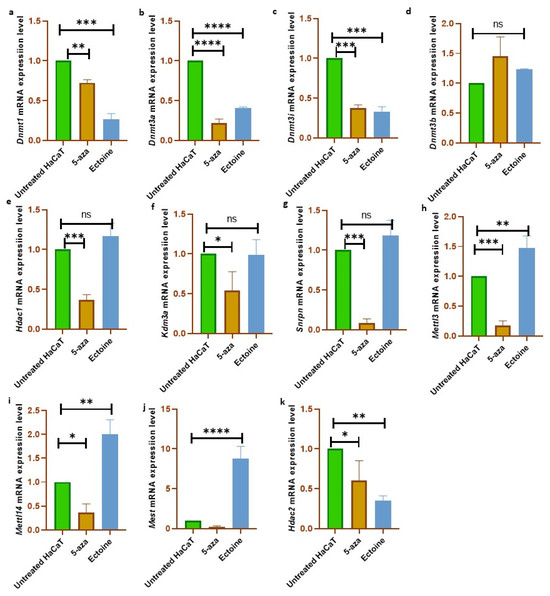 Ectoine modulated the expression level of DNA methylation markers. Bar graphs represent the mRNA expression levels in HaCaT cells treated either with ectoine or 2-aza-deoxycytidine and analyzed using the qPCR technique. The analyzed genes are Dnmt1 (a), Dnmt3a (b), Dnmt3b (c), Dnmt3l (d), Kdm3a (e), Mest (f), Mettl3 (g), Mettl14 (h), Snrpn (i), Hdac1 (j), and Hdac2 (k). (**** p < 0.0001), (*** p < 0.001), (** p < 0.005), (* p < 0.01), (ns denotes p > 0.05).