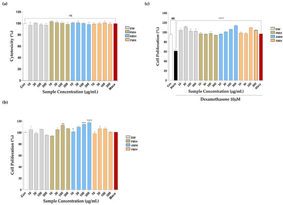 Figure 2. Effect of DW, PMH, AMH, and FMH on C2C12 cell proliferation. (a) Cytotoxicity, (b) cell proliferation, and (c) Dex-induced C2C12 cell proliferation. Experiments were carried out in triplicate, and the results are presented as means ± SD (n = 3). ## p < 0.01 vs. control; * p < 0.05, ** p < 0.01, *** p < 0.001, **** p < 0.0001 vs. blank and “ns”: not significant.