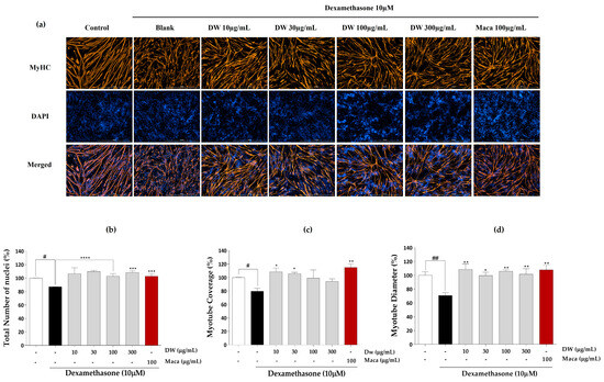Figure 3. Immunofluorescence images of DW. (a) Immunostaining images with MyHC, (b) total number of nuclei, (c) myotube coverage, and (d) myotube diameter. Experiments were carried out in triplicate, and the results are presented as means ± SD (n = 3). # p < 0.05 and ## p < 0.01 vs. control; * p < 0.05, ** p < 0.01, *** p < 0.001, and **** p < 0.0001 vs. blank.