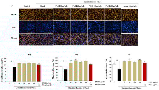 Figure 4. Immunofluorescence images of PMH. (a) Immunostaining images with MyHC, (b) total number of nuclei, (c) myotube coverage, and (d) myotube diameter. Experiments were carried out in triplicate, and the results are presented as means ± SD (n = 3). # p < 0.05 and ## p < 0.01 vs. control; ** p < 0.01, *** p < 0.001, and **** p < 0.0001 vs. blank.
