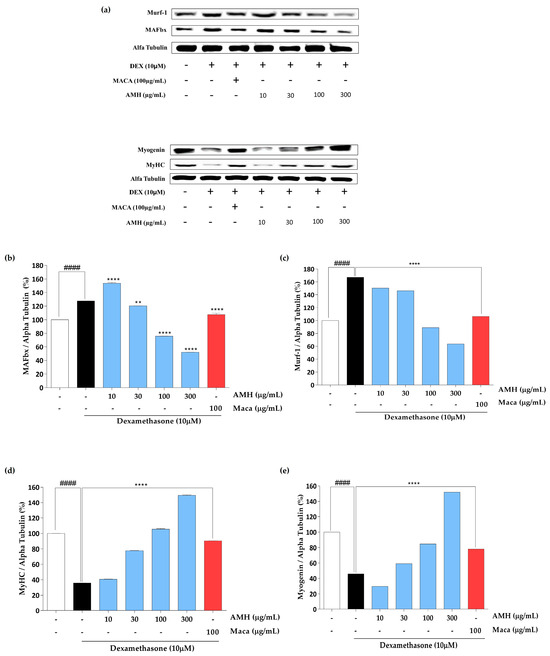 Figure 7. Assessment of AMH on proteins responsible for muscle atrophy. (a) Protein expressions evaluated by Western blot; (b) quantification of the expression of MAFbx protein, (c) Murf-1, (d) MyHC, and (e) myogenin. The data are represented as mean ± SE. #### p < 0.0001 vs. control; dexamethasone group ** p < 0.01, and **** p < 0.0001 vs. blank.