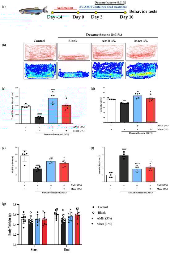 Adult zebrafish were purchased from a commercial supplier (World Fish Aquarium Corp, Jeju-do, Republic of Korea) and reared in clear acrylic tanks with specific conditions, including temperature of 28.5 ± 1 °C, 14/10 h light/dark cycle, and twice-daily feedings from Tetra GmgH (D-49304 Melle, Made in Germany). To establish the Dex-induced muscle atrophy model in zebrafish, individuals with a consistent body weight (3.25 ± 0.05 g) were divided into various groups: (1) control, (2) blank, (3) AMH (3%), and (4) maca (3%). All groups were provided with a recommended zebrafish-exclusive diet containing the specified samples, except for the blank and control groups. As zebrafish can absorb drug compounds through their skin and gills, formulated dexamethasone solution of 0.01% concentration was used to treat the fish for 1 h per day prior to feeding. The Dex exposure lasted for 10 days, and the samples containing diet were introduced three days before Dex exposure. To assess muscle atrophy in zebrafish, their swimming-related behaviors, including total distance moved, velocity, mobility state, and immobility state, were monitored and analyzed using Ethovision XT software 15.0 (Noldus Information Technology, Wageningen, The Netherlands).