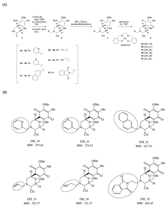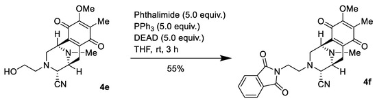 The various previously synthesized N-alkylated compounds, 3, with phenol in the E ring were oxidized to the corresponding p-quinone, 4, by using salcomine. In this study, we also synthesized 4d with an alkyne instead of an aromatic ring and 4f with a phthalimide, with the substituent at the C-1 position of phthalascidine. Synthesis of 4f was performed through amino alcohol 2e. The lactam carbonyl was partially reduced to generate aminal, which was then treated with KCN and acetic acid to give the aminonitrile 2e as a single diastereomer. Next, 2e was debenzylated by reaction with BCl3 in the presence of pentamethylbenzene, and the corresponding phenol 3e was synthesized [26]. Oxidation of 3e with O2 in the presence of salcomine afforded p-quinone 4e (Figure 1A). Finally, phthalimide moiety was introduced by utilizing the Mitsunobu procedure [27]. The structures of all synthesized compounds (Figure 1B) were analyzed and confirmed by detailed spectral analysis, including 2D-NMR.