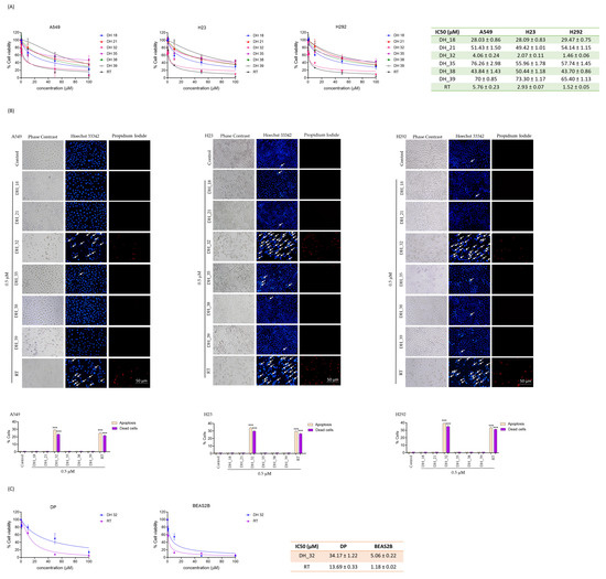 Screening for right-half RT derivatives—DH_18, DH_21, DH_32, DH_35, DH_38, and DH_39—on cell viability and apoptosis in lung cancer cells (A549, H23, and H292). (A) Human lung cancer cells were seeded and treated with right-half RT derivatives (0–100 μM) for 24 h. An MTT assay was performed to evaluate IC50 values for right-half RT derivatives used to treat human lung cancer cells. The IC50 values were calculated in comparison to the RT parent compound, which acted as a positive control. (B) NSCLC cells were seeded and treated with right-half RT derivatives (0.5 μM) for 24 h. The apoptosis and dead cells were evaluated by co-staining with Hoechst 33342 and PI. The images were captured with a fluorescence microscope, and the percentages for apoptosis and dead cells were calculated. RT served as a positive control. (C) Human dermal papilla cells (DP) and a non-tumorigenic epithelial cell line from human bronchial epithelium cells (BEAS2B) were seeded and treated with DH_32 (0–100 μM) for 24 h. An MTT assay was performed to evaluate IC50 values for DH_32-treated human dermal papilla cells (DP) and non-tumorigenic epithelial cell line from human bronchial epithelium cells (BEAS2B) cells. The IC50 values were calculated in comparison to the RT parent compound, which acted as a positive control. Data are presented as mean ± SD (n = 3). Significance is shown as *** p < 0.001 versus untreated control cells.