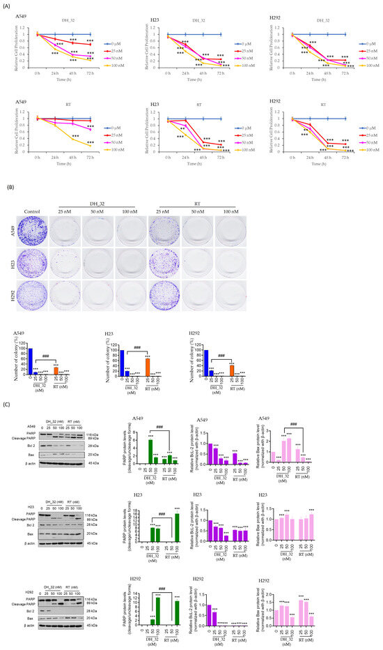 DH_32 demonstrated antiproliferative effects, inhibiting colony formation and inducing apoptosis. RT served as the positive control. (A) The proliferative effect of DH_32 on lung cancer cells was evaluated by an MTT assay for 24, 48, and 72 h, analyzed as the relative value to the control group at 0 h. (B) NSCLC cells were seeded and treated with DH_32 (0–100 nM) for 24 h. The colonies were allowed to grow for 7 days and stained with crystal violet to count the number of colony formations. (C) Human lung cancer cells were treated with DH_32 (0–100 nM) for 24 h. The levels of apoptotic-related proteins, including cleaved PARP, Bcl-2, and Bax, were determined by Western blot analysis. The blot was reprobed with β-actin to confirm the equal loading of proteins. Data are presented as mean ± SD (n = 3). Significant is shown as ** p < 0.01, *** p < 0.001 versus untreated control cells and ### p < 0.001 versus RT-treated NSCLCs.