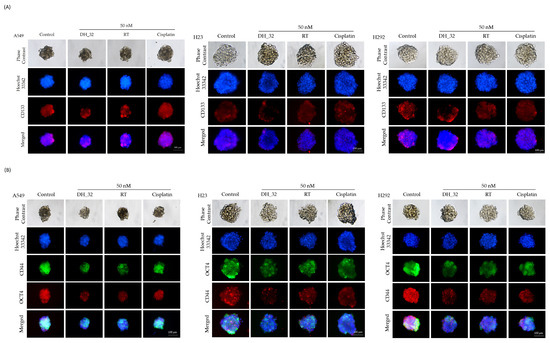 The CSC spheroids of A549, H23, and H292 cells were treated with a low concentration of DH_32 (50 nM), and the expression levels of CSC markers and stem cell transcription factors (CD133, CD44, and OCT4) were analyzed by the immunofluorescence method. Figure 4A,B show that DH_32 treatment in CSCs caused a dramatic decrease in the levels of CD133, CD44, and OCT4, implying the depletion of stem cell phenotypes. For comparison, RT was used as a positive control, and results show that RT caused lesser effects on the CSC population. As it was previously demonstrated that the CSC population can resist conventional chemotherapy, including cisplatin [28,29], we similarly treated the spheroids with cisplatin and measured the CD133, CD44, and OCT4 levels. Treatment with cisplatin (50 nM) could not alter CSC markers in these spheroids (Figure 4A).