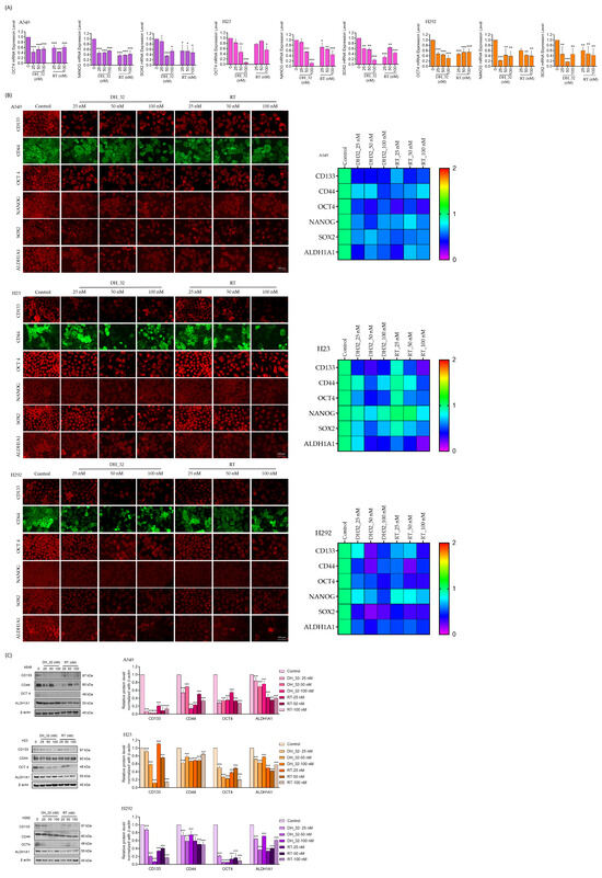 Next, the protein expression of such transcription factors was determined. A549, H23, and H292 cells were treated with low concentrations of DH_32 (25, 50, and 100 nM) for 24 h, and then the expression levels of the stem cell markers (CD133, CD44, and ALDH1A1), as well as the stem cell transcription factors (OCT-4, NANOG, and SOX2), were analyzed by immunofluorescence assays. The heatmap illustration in Figure 5B indicates that DH_32 treatments caused a significant reduction in stem cell markers and transcription factors in A549, H23 and H292 cells compared to cancer cells treated with the RT parent compound (Figure 5B). Therefore, treatment with the RT analog DH_32 serves as a stem-cell-targeted therapy for human lung cancer cells.