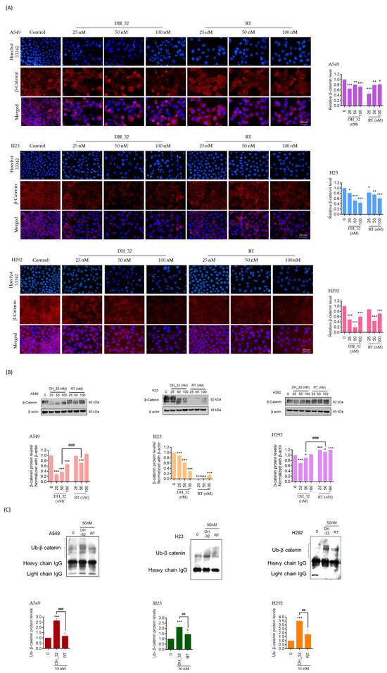 β-Catenin is known to regulate upstream signaling for the expression of cancer stem cell phenotypes in lung cancer cells [19]. To investigate the mechanism of action of DH_32, A549, H292, and H23 cells were similarly treated with DH_32 (0–100 nM) for 24 h, and the expression levels of β-catenin were determined by immunofluorescence. The results showed that DH_32-treated cancer cells exhibited a decrease in the fluorescence signal of β-catenin. However, RT compounds at a concentration of 25 nM exhibited an unaltered level of β-catenin in the cell (Figure 6A). Next, the level of β-catenin proteins was confirmed by Western blot analysis. Figure 6B shows that DH_32 treatments caused a significant decrease in the β-catenin protein level in A549, H23, and H292 cells.