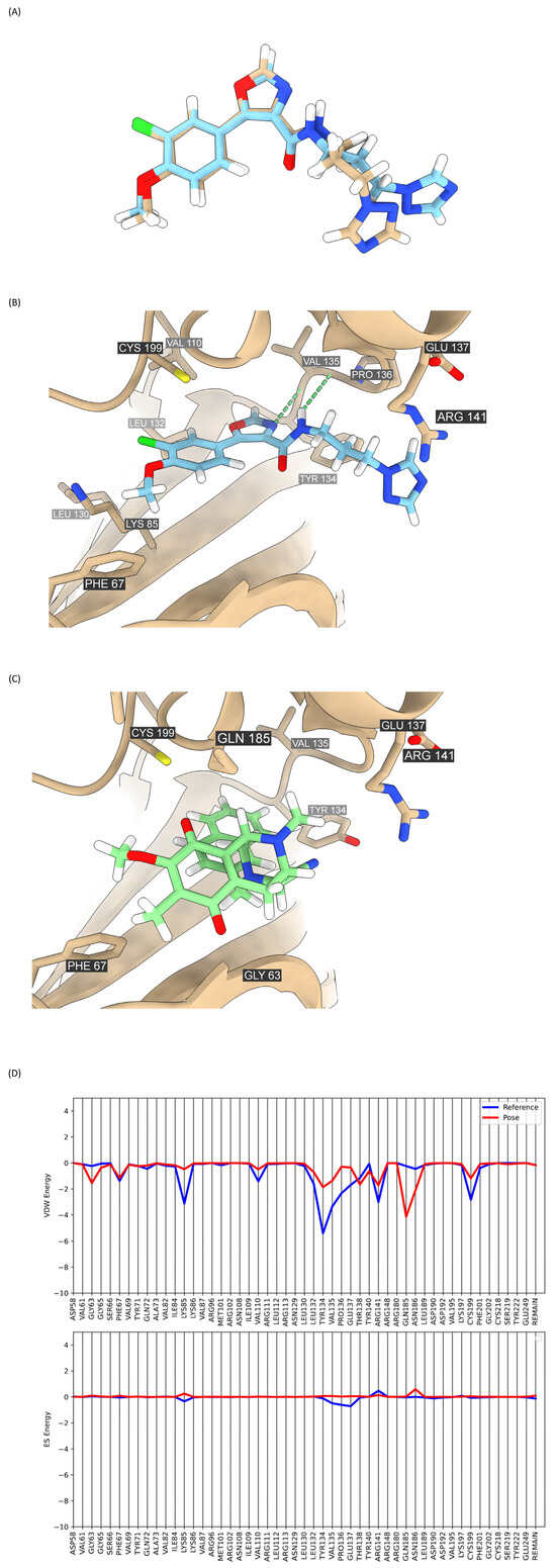 To further uncover the possible mechanism by which DH_32 regulates β-catenin stability, we utilized molecular docking analysis to investigate the possible interaction of the compound with β-catenin regulatory protein GSK-3β. PF-04802367, a selective binding of the GSK-3β protein, was employed as a reference compound in the docking method (PDB: 5K5N). Redocking of the native ligand (PF-04802367) at the ATP site of GSK-3β was performed, and the reported RMSD between the native ligand and docked conformation was 1.8431 Å, which is considered a successful docking protocol (Figure 7A). Based on the molecular docking study, the grid score of DH_32 (−38.421 kcal/mol) was higher than that of PF-04802367 (−49.199 kcal/mol), suggesting a lower binding affinity to GSK-3β (Table 1). Furthermore, the effective potency of GSK-3β is reliant on a crucial interaction involving a hydrogen bond with Val135. This interaction is recognized as pivotal for achieving optimal GSK-3β activity [31]. The result revealed that PF-04802367 exhibited interaction with Val135 in the hinge region, while DH_32 does not create a hydrogen bond (Figure 7B,C). Compared with the footprint analysis results for DH_32 and PF-04802367 regarding specific VDW or ES energies, we find that DH_32 makes less favorable VDW energies compared to PF-04802367 at specific residues such as Phe67, Lys85, Val110, Leu130, Leu132, Tyr134, Val135, Pro136, Glu137, Arg141, and Cys199. A slightly unfavorable ES energy with Lys85, Leu132, Tyr134, Val135, Pro136, and Asn186 was also uncovered (Figure 7D). Our findings demonstrated that DH_32 does not bind to GSK-3β in a significant way.