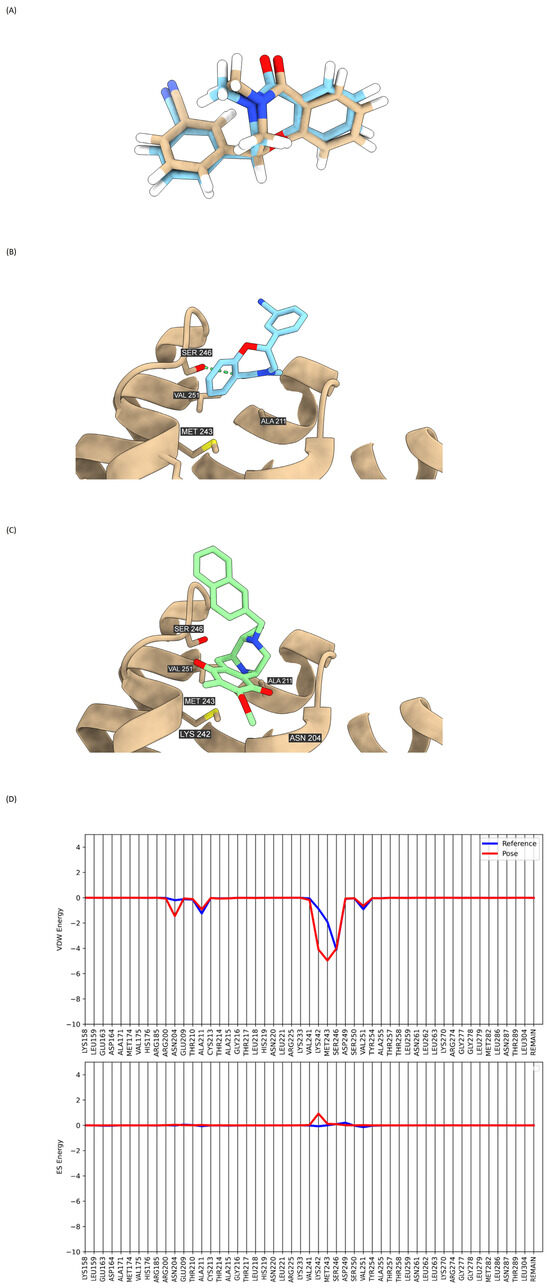 R9Q, a direct inhibitor of β-catenin, was utilized as a reference compound in the docking method (PDB: 7AFW). The redocking of the native ligand (R9Q) at the binding site of β-catenin was performed, resulting in a reported RMSD of 0.4852 Å, which falls within an acceptable range (<2 Å) (Figure 8A). According to the molecular docking study, the grid score of DH_32 (−35.559 kcal/mol) was lower than that of R9Q (−29.044 kcal/mol), indicating a higher binding affinity to β-catenin than the reference compound (Table 2). DH_32 adopted a similar binding mode as R9Q, with an interface between armadillo repeats 2 (residues 205–210) and 3 (residues 243–251) (Figure 8B,C). The footprint analysis confirmed that DH_32 interacts favorably with Asn204, Ala211, Lys242, Met243, Ser246, and Val251 (Figure 8D). This suggests that the contribution of van der Waals (VDW) energy is the most significant factor in the interaction between the ligands and residues at the β-catenin binding site. This finding strongly supports the notion that DH_32 significantly inhibits β-catenin via direct action.