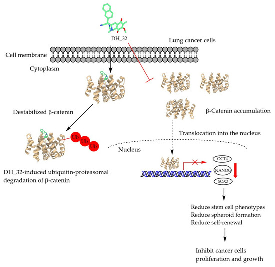 Summarized figure for the effect of direction interactions of the right-half RT analog, DH_32, with targeted β-catenin in lung cancer cells. This study revealed that DH_32 has the ability to reduce stem cell markers (CD133, CD44, and ALDH1A1) and stem cell transcription factors (OCT4, NANOG, and SOX2) in lung cancer cells. Moreover, the inhibitory impacts on the CSC characteristics and stem cell transcription factors achieved by DH_32 are mediated through the proteasomal degradation of β-catenin.