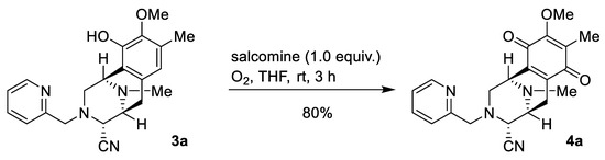 To a solution of phenol, 3a (9.6 mg, 26.3 µmol), in THF (0.7 mL) was added salcomine (9.5 mg, 26.3 µmol, 1.0 eq.) at room temperature, and the reaction mixture was stirred for 3 h under an O2 atmosphere (Scheme 1). The reaction mixture was filtered through a cellulose pad and washed with EtOAc. The filtrate was concentrated in vacuo to give a residue. The residue was purified by SiO2 flash column chromatography (CH2Cl2: MeOH = 99:1) to afford compound 4a (8.0 mg, 80%) as a yellow amorphous substance. [α]27D −12.8 (c 0.16, CHCl3); IR (KBr) 3012, 2943, 28493, 1653, 1615, 1434, 1374, 1308, 1236, 1155, 1005, 951, 864, 755, 667 cm−1; 1H-NMR (400 MHz, CDCl3) δ 8.51 (1H, dt, J = 4.8, 1.2 Hz, 4′-H), 7.58 (1H, td, J = 7.7, 1.2 Hz, 6′-H), 7.16 (1H, dd, J = 7.7, 4.8 Hz, 5′-H), 7.12 (1H, d, J = 7.7 Hz, 7′-H), 4.00 (3H, s, 9-OCH3), 3.87 (1H, s, 1-H), 3.77 (2H, s, 1′-H), 3.67 (1H, d, J = 2.1 Hz, 4-H), 3.31 (1H, dt, J = 7.4, 2.1 Hz, 5-H), 3.03 (1H, dd, J = 11.5, 3.3 Hz, 2-H), 2.72 (1H, dd, J = 20.8, 7.4 Hz, 6-H), 2.61 (1H, d, J = 11.5 Hz, 2-H), 2.33 (3H, s, 11N-CH3), 2.17 (1H, d, J = 20.8 Hz, 6-H), 1.99 (3H, s, 8-CH3); 13C-NMR (100 MHz, CDCl3) δ: 186.9 (C), 182.3 (C), 156.5 (C), 155.3 (C), 149.7 (CH), 141.0 (C), 137.2 (C), 136.6 (CH), 128.8 (C), 122.7 (CH), 122.7 (CH), 115.9 (C), 61.0 (CH3), 60.6 (CH2), 58.4 (CH), 54.6 (CH), 51.8 (CH2), 51.3 (CH), 41.5 (CH3), 20.8 (CH2), 8.8 (CH3); EIMS m/z (%) 378 (M+, 6), 220 (23), 219 (100), 218 (36), 204 (24), 176 (11), 160 (38), 93 (20); HRMS (EI) m/z 378.1689 (M+, calcd for C21H22N4O3, 378.1692). The 1H-NMR and 13C-NMR figures are shown in Figure S1A,B.