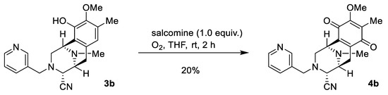 To a solution of phenol, 3b (10.9 mg, 29.9 µmol), in THF (0.8 mL) was added salcomine (11.0 mg, 29.9 µmol, 1.0 eq.) at room temperature, and the reaction mixture was stirred for 2 h under an O2 atmosphere (Scheme 2). The reaction mixture was filtered through a cellulose pad and washed with EtOAc. The filtrate was concentrated in vacuo to give a residue. The residue was purified by SiO2 flash column chromatography (CH2Cl2: MeOH: Et3N = 98:1:1) to afford compound 4b (2.3 mg, 20%) as a yellow amorphous substance. [α]26D +20.1 (c 0.09, CHCl3); IR (KBr) 2929, 1652, 1307, 1236, 1157, 757, 490, 476, 458, 448, 442, 435, 423, 409 cm−1; 1H-NMR (400 MHz, CDCl3) δ 8.51 (1H, dd, J = 4.8, 1.1 Hz, 5′-H), 8.43 (1H, d, J = 1.6 Hz, 3′-H), 7.47–7.45 (1H, m, 7′-H), 7.21 (1H, dd, J = 7.7, 4.8 Hz, 6′-H), 4.00 (3H, s, 9-OCH3), 3.87 (1H, s, 1-H), 3.66 (1H, d, J = 13.6 Hz, 1′-H), 3.60 (1H, d, J = 13.6 Hz, 1′-H), 3.55 (1H, d, J = 1.8 Hz, 4-H), 3.31 (1H, d, J = 7.2 Hz, 5-H), 2.96 (1H, dd, J = 11.5, 3.1 Hz, 2-H), 2.72 (1H, dd, J = 20.6, 7.2 Hz, 6-H), 2.58 (1H, d, J = 11.5 Hz, 2-H), 2.33 (3H, s, 11N-CH3), 2.11 (1H, d, J = 20.6 Hz, 6-H), 2.00 (3H, s, 8-CH3); 13C-NMR (100 MHz, CDCl3) δ: 186.7 (C), 182.2 (C), 155.3 (C), 150.1 (CH), 149.5 (CH), 140.9 (C), 137.1 (C), 136.2 (CH), 131.7 (C), 128.8 (C), 123.6 (CH), 115.4 (C), 61.0 (CH3), 58.0 (CH), 56.5 (CH2), 54.4 (CH), 51.7 (CH2), 51.2 (CH), 41.4 (CH3), 20.8 (CH2), 8.8 (CH3); EIMS m/z (%) 378 (M+, 5), 220 (20), 219 (87), 218 (100), 204 (26), 176 (11); HR-EI-MS m/z 378.1692 (M+, calcd for C21H22N4O3, 378.1693). The 1H-NMR and 13C-NMR figures are shown in Figure S2A,B.