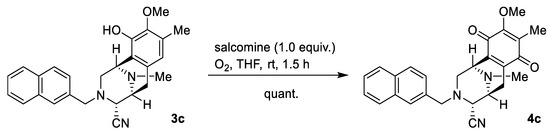 To a solution of phenol, 3c (8.2 mg, 19.8 µmol), in THF (0.5 mL) was added salcomine (8.2 mg, 19.8 µmol, 1.0 eq.) at room temperature, and the reaction mixture was stirred for 1.5 h under an O2 atmosphere (Scheme 3). The reaction mixture was filtered through a cellulose pad and washed with EtOAc. The filtrate was concentrated in vacuo to give a residue. The residue was purified by SiO2 flash column chromatography (CH2Cl2: MeOH = 99:1) to afford compound 4c (9.8 mg, quant.) as a yellow amorphous substance. [α]24D +37.2 (c 0.16, CHCl3); IR (KBr) 3017, 2941, 2829, 1652, 1616, 1448, 1307, 1235, 1152, 950, 863, 822, 755, 476, 463, 437, 430, 419, 412 cm−1; 1H-NMR (400 MHz, CDCl3) δ 7.80-7.77 (1H, m, 1′-Np), 7.74-7.71 (2H, m, 1′-Np), 7.64 (1H, s, 1′-Np), 7.50-7.44 (2H, m, 1′-Np), 7.22 (1H, dd, J = 8.4, 1.7 Hz, 1′-Np), 3.95 (3H, s, 9-OCH3), 3.89 (1H, s, 1-H), 3.81 (1H, d, J = 13.3 Hz, 1′-H), 3.71 (1H, d, J = 13.3 Hz, 1′-H), 3.57 (1H, d, J = 2.3 Hz, 4-H), 3.26 (1H, d, J = 7.3 Hz, 5-H), 3.01 (1H, dd, J = 11.7, 3.2 Hz, 2-H), 2.68 (1H, dd, J = 20.6, 7.3 Hz, 6-H), 2.62 (1H, dd, J = 11.7, 0.9 Hz, 2-H), 2.33 (3H, s, 11N-CH3), 2.13 (1H, d, J = 20.6 Hz, 6-H), 2.05 (3H, s, 8-CH3); 13C-NMR (100 MHz, CDCl3) δ 186.9 (C), 182.3 (C), 155.4 (C), 141.0 (C), 137.3 (C), 133.7 (C), 133.2 (C), 133.0 (C), 128.6 (CH), 128.6 (C), 127.7 (CH), 127.7 (CH), 127.6 (CH), 126.4 (CH), 126.1 (CH), 126.0 (CH), 115.8 (C), 60.9 (CH3), 59.0 (CH2), 57.8 (CH), 54.5 (CH), 51.6 (CH2), 51.3 (CH), 41.5 (CH3), 20.8 (CH2), 8.8 (CH3); EIMS m/z (%) 427 (M+, 17), 220 (25), 219 (77), 218 (100), 204 (17), 141 (40); HRMS (EI) m/z 427.1898 (M+, calcd for C26H25N3O3, 427.1896). The 1H-NMR and 13C-NMR figures are shown in Figure S3A,B.