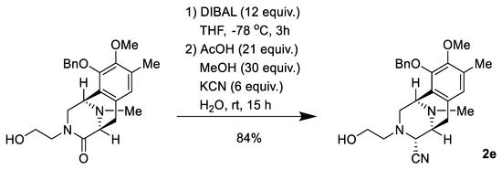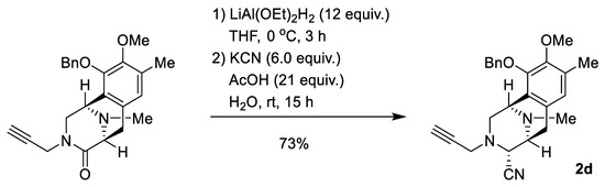 To a solution of lactam (46.4 mg, 119 µmol) in THF (2.3 mL) at 0 °C was slowly added LiAlH2(OEt)2 (1.0 mol/L in CH2Cl2, 1.4 mL, 1.4 mmol, 12 eq.) over 10 min. The reaction mixture was stirred at 0 °C for 3 h. The reaction mixture was quenched with AcOH (145 µL, 2.50 mmol, 21 equiv.), followed by the addition of KCN (55.2 mg, 713 µmol, 6.0 equiv.) in H2O (250 µL), and stirring was continued for 15 h at 25 °C (Scheme 4). The reaction mixture was neutralized with 5% NaHCO3 solution and diluted with saturated Rochell’s salt aq., and the mixture was stirred for 1 h. The reaction mixture was extracted with CHCl3 (3 × 50 mL). The combined extracts were washed with brine (50 mL), dried over Na2SO4, and concentrated in vacuo to give a residue. The residue was purified by SiO2 flash column chromatography (CHCl3: MeOH = 19:1) to afford compound 2d (34.6 mg, 73%) as a colorless amorphous substance. [α]24D −47.0 (c 0.14, CHCl3); IR (KBr) 3306, 3012, 2938, 2821, 1483, 1456, 1412, 1322, 1230, 1158, 1061, 1029, 900, 796, 753, 700, 666, 482, 439, 415 cm−1; 1H-NMR (400 MHz, CDCl3) δ 7.39-7.28 (5H, m, 10-OCH2Ph-H), 6.65 (1H, s, 7-H), 5.08 (2H, d, J = 2.1 Hz, 10-OCH2Ph), 4.10 (1H, d, J = 2.3 Hz, 4-H), 3.92 (1H, s, 1-H), 3.85 (3H, s, 9-OCH3), 3.30 (1H, d, J = 8.4 Hz, 5-H), 3.15 (2H, d, J = 2.5 Hz, 1′-H), 3.03 (1H, dd, J = 17.7, 8.4 Hz, 6-H), 2.80 (1H, dd, J = 10.9, 3.2 Hz, 2-H), 2.56 (1H, ddd, J = 10.9, 2.2, 1.1 Hz, 2-H), 2.45 (1H, d, J = 17.7 Hz, 6-H), 2.27 (3H, s, 8-CH3), 2.20 (1H, t, J = 2.5 Hz, 3′-H), 2.10 (3H, s, 11N-CH3); 13C-NMR (100 MHz, CDCl3) δ: 148.9 (C), 148.2 (C), 137.4 (C), 130.4 (C), 129.8 (C), 128.6 (CH×2), 128.5 (CH×2), 128.2 (CH), 126.1 (C), 124.6 (CH), 116.0 (C), 78.1 (CH), 74.4 (CH2), 73.8 (C), 60.0 (CH3), 58.1 (CH), 55.2 (CH), 54.1 (CH2), 52.4 (CH), 44.4 (CH2), 41.2 (CH3), 24.9 (CH2), 15.8 (CH3); EIMS m/z (%) 401 (M+, 2), 295 (26), 294 (100), 243 (16), 204 (25), 203 (23); HRMS (EI) m/z 401.2106 (M+, calcd for C25H27N3O2, 401.2103). The 1H-NMR and 13C-NMR figures are shown in Figure S4A,B.