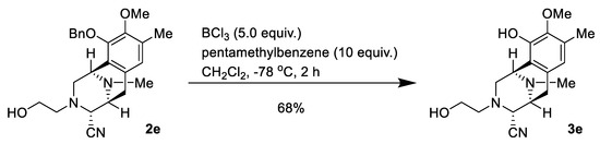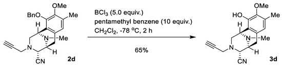 To a solution of 2d (24.0 mg, 59.8 μmol) and pentamethylbenzene (89.0 mg, 598 μmol, 10.0 eq.) in CH2Cl2 (7.6 mL) was added BCl3 (1.0 mol/L in CH2Cl2, 300 µL, 300 µmol, 5 eq.) over 30 min at −78 °C, and the mixture was stirred for 2 h (Scheme 5). The reaction mixture was diluted with CH2Cl2 (30.0 mL) and quenched with saturated NaHCO3 solution at 0 °C. The mixture was extracted with CH2Cl2 (3 × 40 mL). The combined extracts were washed with brine (30 mL), dried over Na2SO4, and concentrated in vacuo to give a residue. The residue was purified by SiO2 flash column chromatography (n-hexane: AcOEt = 2:1) to afford compound 3d (12.1 mg, 65%) as a colorless amorphous substance. [α]24D −78.4 (c 0.09, CHCl3); IR (KBr) 3530, 3426, 3307, 3020, 2938, 2825, 1718, 1587, 1458, 1231, 1157, 1059, 756, 668, 503, 458, 434, 428, 422, 404 cm−1; 1H-NMR (500 MHz, CDCl3) δ 6.44 (1H, s, 7-H), 5.63 (1H, brs, 10-OH), 4.15 (1H, d, J = 1.7 Hz, 4-H), 4.08 (1H, s, 1-H), 3.78 (3H, s, 9-OCH3), 3.36 (1H, d, J = 7.8 Hz, 5-H), 3.22 (2H, d, J = 2.6 Hz, 1′-H), 3.08 (1H, dd, J = 17.8, 7.8 Hz, 6-H), 2.90 (1H, dd, J = 10.7, 2.6 Hz, 2-H), 2.74 (1H, dt, J = 10.7, 1.1 Hz, 2-H), 2.47 (1H, d, J = 17.8 Hz, 6-H), 2.34 (3H, s, 11N-CH3), 2.26 (3H, s, 8-CH3), 2.22 (1H, t, J = 2.6 Hz, 3′-H); 13C-NMR (125 MHz, CDCl3) δ 145.4 (C), 142.8 (C), 130.4 (C), 128.4 (C), 120.7 (CH), 118.9 (C), 116.0 (C), 78.1 (C), 73.8 (CH), 60.7 (CH3), 58.1 (CH), 55.3 (CH), 53.4 (CH2), 52.0 (CH), 44.5 (CH2), 41.5 (CH3), 24,9 (CH2), 15.8 (CH3); EIMS m/z (%) 311 (M+, 2), 205 (20), 204 (100); HRMS (EI) m/z 311.1632 (M+, calcd for C18H21N3O2, 311.1634). The 1H-NMR and 13C-NMR figures are shown in Figure S5A,B.