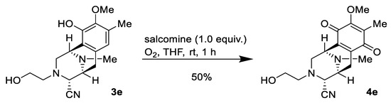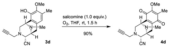 To a solution of phenol, 3d (6.0 mg, 19.3 µmol), in THF (0.5 mL) was added salcomine (7.4 mg, 19.3 µmol, 1.0 eq.) at room temperature, and the reaction mixture was stirred for 1.5 h under an O2 atmosphere (Scheme 6). The reaction mixture was filtered through a cellulose pad and washed with EtOAc. The filtrate was concentrated in vacuo to give a residue. The residue was purified by SiO2 flash column chromatography (CH2Cl2: MeOH = 99:1) to afford compound 4d (5.7 mg, 90%) as a yellow amorphous substance. [α]24D −65.2 (c 0.09, CHCl3); IR (KBr) 3307, 3020, 2941, 2853, 1653, 1615, 1458, 1308, 1236, 1216, 1157, 863, 752, 668, 469, 462, 448, 440, 432, 425, 419, 413 cm−1; 1H-NMR (400 MHz, CDCl3) δ 4.05 (1H, d, ¬J = 2.1 Hz, 4-H), 4.02 (3H, s, 9-OCH3), 3.85 (1H, d, J = 1.1 Hz, 1-H), 3.37 (1H, dt, J = 7.4, 2.1 Hz, 5-H), 3.25 (2H, d, J = 2.5 Hz, 1′-H), 2.87 (1H, dd, J = 11.4, 3.3 Hz, 2-H), 2.75 (1H, dd, J = 20.8, 7.4 Hz, 6-H), 2.60 (1H, ddd, J = 11.4, 2.1, 1.1 Hz, 2-H), 2.32 (3H, s, 11N-CH3), 2.26 (1H, t, J = 2.5 Hz, 3′-H), 2.22 (1H, d, J = 20.8 Hz, 6-H), 1.97 (3H, s, 8-CH3); 13C-NMR (100 MHz, CDCl3) δ 186.9 (C), 182.4 (C), 155.3 (C), 141.0 (C), 136.8 (C), 129.0 (C), 115.4 (C), 77.7 (CH), 74.2 (C), 61.0 (CH3), 57.5 (CH), 54.5 (CH), 51.6 (CH2), 51.0 (CH), 44.3 (CH2), 41.5 (CH3), 20.8 (CH2), 8.8 (CH3); EIMS m/z (%) 325 (M+, 6), 220 (12), 219 (67), 218 (100), 204 (31); HRMS (EI) m/z 325.1428 (M+, calcd for C18H19N3O3, 325.1426). The 1H-NMR and 13C-NMR figures are shown in Figure S6A,B.