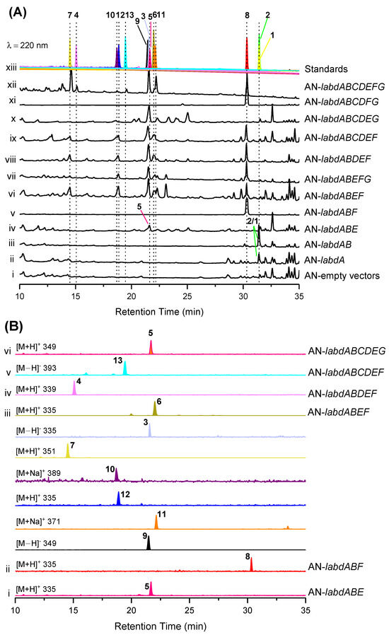 Combinatorial heterologous expression of the labd cluster in A. nidulans (AN). (A) LC-MS profiles of the EtOAc extracts derived from the A. nidulans transformants (i–xii) in comparison with the separated and purified compounds (xiii). (B) LC-MS traces of extracts from mutant strains (i–vi). The chromatograms were recorded at 220 nm on the Shimadzu UFLC system connected in series with the Shimadzu LCMS-2020 mass spectrometer. Separated compounds marked with numbers 1–13 and different colors.