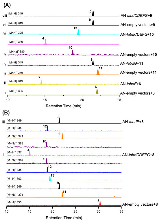 Next, we aimed to reconstitute the complete biosynthetic pathway using A. nidulans feeding experiments. As shown in Figure 6A,B, LabdE can catalyze the conversion from 6 to 7 and 8 to 9–12, respectively, indicating that LabdE is a multifunctional cytochrome P450 enzyme that catalyzes multiple oxidization. The strain AN-labdG fed 11 and produced 9, indicating that LabdG can catalyze the reduction of the ketone group at C-2 in 11 (Figure 6A, traces iii and iv). To identify whether 4 and 13 are products of the labd gene cluster, strain AN-labdCDEFG was constructed and fed 8 and 9 separately. As a result, only 8 was successfully converted to 4 and 9–13 (Figure 6B, traces i and ii). Aside from that, 4 and 13 were also successfully produced from strain AN-labdCDEFG fed 10 (Figure 6A, traces v and vi), confirming that 10 was the direct precursor for the synthesis of 4 and 13.
