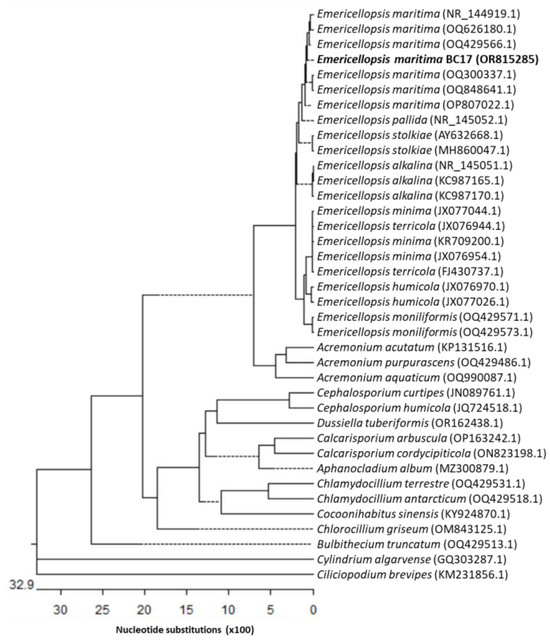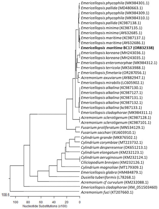 The BC17 fungal strain isolated was identified as E. maritima using the service of the Spanish Type Culture Collection (CECT, https://www.uv.es/cect, accessed on 5 December 2023) based on both phenotypic and molecular techniques. Three regions of the fungal genome were amplified through conventional PCR: (a) amplification and sequencing (with readings in both directions) of the ribosomal DNA region comprising the intergenic spaces ITS1 and ITS2, including the 5.8S rRNA (ITS5 5′-GGAAGTAAAAGTCGTAACAAGG-3′; ITS4 (5′-TCCTCCGCTTATTGATATGC-3′); (b) partial amplification and sequencing (with readings in both directions) of the 28S rRNA gene (LR0R 5′-GTACCCGCTGAACTTAAGC-3′; LR7 5′-TACTACCACCAAGATCT-3′); and (c) partial amplification and sequencing of the β-tubulin gene (with readings in both directions) (Bt2a 5′-GGTAACCAAATCGGTGCTGCTTTC-3′; Bt2b 5′-ACCCTCAGTGTAGTGACCCTTGGC-3′). The sequencing of these regions was compared with those in NCBI databases. Sequences were submitted to the NCBI database with the accession number OR815285 for the ITS region; OR835190 for the 28S rRNA gene; and OR832338 for the β-tubulin gene. To study the phylogenetic relationship of our isolate, other sequences of related genera and species from the class Hypocreales were downloaded from the GenBank database and included in the phylogenetic trees.