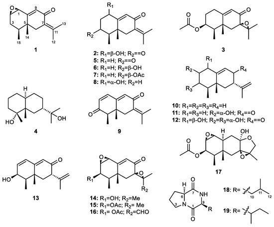 The known compounds were identified through analysis of their 1D and 2D spectra and comparison of their spectroscopic data (Tables S1–S5) and optical activities (Table S6) with those reported in the literature for isopetasone (5) [11,12], (+)-3-epiisopetasol (6) [11,13], (3S)-3-acetoxyeremophil-7(11),9(10)-dien-8-one (7) [14], 1α-hydroxydehydrofukinone (8) [15], warburgiadione (9) [12,16], (+)-aristolochene (10) [17,18,19], 7-hydroxy-4a,5-dimethyl-3-prop-1-en-2-yl-3,4,5,6,7,8-hexahydronaphthalen-2-one (11) [20], guignarderemophilane F (12) [21], 3β-hydroxy-7βH-eremophil-1(2),9(10),11(12)-trien-8-one (13) [22], eremofortin A alcohol (14) [23], eremofortin A (15) [24], PR toxin (16) [24,25], eremofortin D (17) [24], cyclo-(l-Pro-l-Leu) (18) [26,27,28], and cyclo-(l-Pro-l-Ile) (19) [26,28].