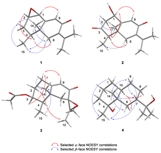 The relative configuration of 3 was elucidated on the basis of correlations observed in the 1D and 2D NOESY experiments (Figures S21 and S22a–f) and comparisons with those described for previously reported natural eremophilanes [14]. As depicted in Figure 4, the NOESY correlations observed for H-9/H-1α, H-3α/H-1α, and H-4α/H-2α suggested that these protons are α-oriented, whereas the correlations of H-1β with H3-14β and H3-15β with H3-14β placed these protons on the β face of the skeleton. The 7,11-epoxy ring was assigned β-oriented on the basis of the NOESY cross-peak between H-4α and H3-12.