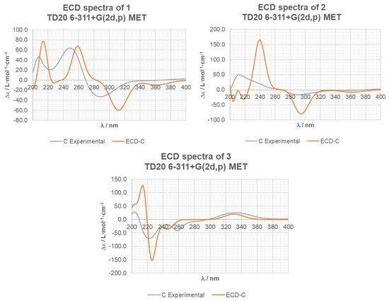 Experimental and calculated ECD spectra for compounds 1–3. Calculations were performed with the conformers shown in Figure 4.