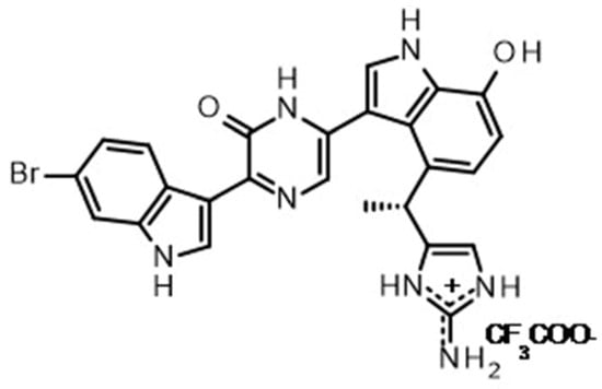 The compound used in this study was obtained from the HBOI Pure compound collection. The sponge source, isolation protocol, and structure elucidation have been reported previously []. It was isolated as its trifluoroacetate salt. The stock material was analyzed using 1H and 13C NMR and high-resolution mass spectrometry prior to use in the studies reported here, and it was found that the material was >98% pure (Supporting Figures S4–S6).