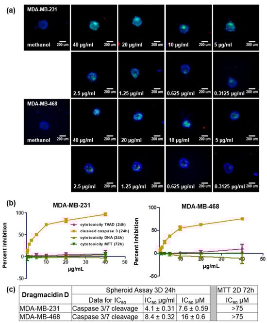 IC50 determination in the MDA-MB-231 and MDA-MB-468 cells. The concentration required to see 50% induction of apoptosis (IC50) in both cell lines was determined using serial dilutions of dragmacidin D ranging from 40 to 0.3125 µg/mL in the screening assay: (a) Representative images from one experiment are shown. Images were taken at 10× magnification. Scale bar is 200 µm. (b) The graphs show the average of three experiments ± standard deviation. The resulting percentages were normalized to solvent control and subjected to nonlinear regression. (c) The IC50 values shown represent the average of 3 experiments ± standard deviation for the spheroid assay. No cytotoxicity was seen at all in the MTT 2D assay even at the highest concentration tested (40 µg/mL ≈ 75 µM). Thus, the IC50 is reported as >75 µM.