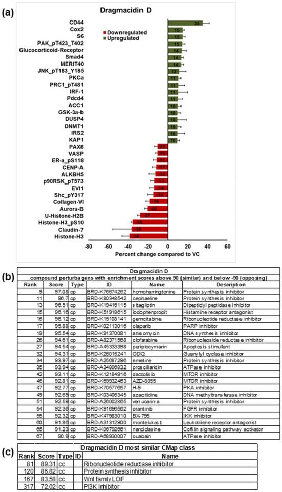 A reverse-phase protein array (RPPA) [] was used to obtain insight into the changes in signaling induced by treatment with dragmacidin D. This array contains more than 450 antibodies representing important cell signaling pathways in cancer. Because dragmacidin D was more potent in the MDA-MB-231 cells, this cell line was chosen for this experiment. Spheroids were treated with 1X IC50 dragmacidin D or a methanol solvent control for 24 h, at which time the protein was extracted. The protein from three independent experiments was sent to the RPPA core at MD Anderson for testing and analysis. The core provided normalized data for the samples. The data from the three independent experiments were averaged, and the results for spheroids treated with dragmacidin D were compared to the solvent-control-treated spheroids to obtain a differential protein expression profile. The proteins that changed levels by more than 10% are shown in Figure 5a. The five most upregulated proteins were CD44 (35%), Cox2 (15%), ribosomal protein S6 (15%), p21-activated kinases (PAKs) phosphorylated at threonines 423 and 402 (15%), and the glucocorticoid receptor (14%). CD44 regulates many cellular functions, including cellular proliferation and metastasis []. Activated PAKs have been associated with cell cycle regulation and inflammation []. While both Cox2 and glucocorticoids are involved in the regulation of inflammation, Cox2 promotes it, while glucocorticoids suppress the production of inflammatory cytokines, including those regulated by Cox2 []. Ribosomal protein S6 regulates cell growth and proliferation []. Interestingly, many of the proteins most downregulated are histones. The five proteins most downregulated were histone H3 (38%), claudin 7 (36%), phosphorylated histone H3 at serine 10 (35%), ubiquitinated histone H2B (27%), and aurora kinase B (20%). Claudin 7 is an important component of tight junctions, a barrier that regulates the movement of solutes, ions, and water across and between cells []. Histone H3 phosphorylation by aurora kinase B is one of the hallmarks of mitosis []. The ubiquitination of histone H2B enhances nucleosome stability, which is of importance in the regulation of chromatin dynamics []. Histone depletion can lead to cell cycle arrest and changes in gene expression [].