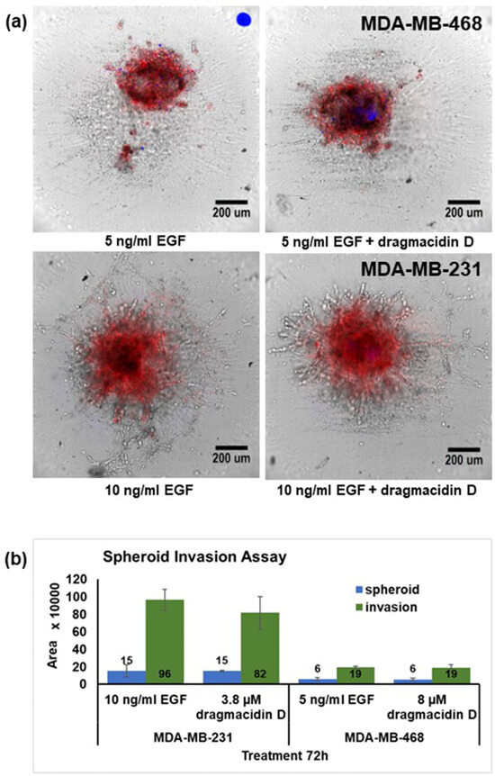 Effects of dragmacidin D in a spheroid invasion assay. Cells were plated and spheroids allowed to form overnight, with those from MDA-MB-231 using media containing only 5% FBS, while MDA-MB-468 cells received the normal 10% FBS media and then were encapsulated in matrigel supplemented with 5 or 10 ng/mL epidermal growth factor for the MDA-MB-468 and MDA-MB-231, respectively. The matrigel was allowed to set at 37 °C for 45 min when treatments of 0.5X IC50 dragmacidin D or media alone (complete media w/o phenol red at normal 10% FBS) were added. Spheroids cultured in the presence of EGF alone invaded the matrigel capsule: (a) Representative images of one experiment are shown. There was a slight decrease in the invasion when treatment of dragmacidin D was given. (b) The area of the spheroids and the invasion was measured, and the average of three independent experiments ± standard deviation is shown in the graph. While the perceived reduction in invasion was also captured in the measurements, the decrease failed to be statistically significant.