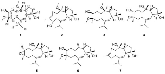 - Yang, B.; Zhou, X.F.; Lin, X.P.; Liu, J.; Peng, Y.; Yang, X.W.; Liu, Y.H. Cembrane diterpenes chemistry and biological properties. Curr. Org. Chem. 2012, 16, 1512–1539. [Google Scholar] [CrossRef]