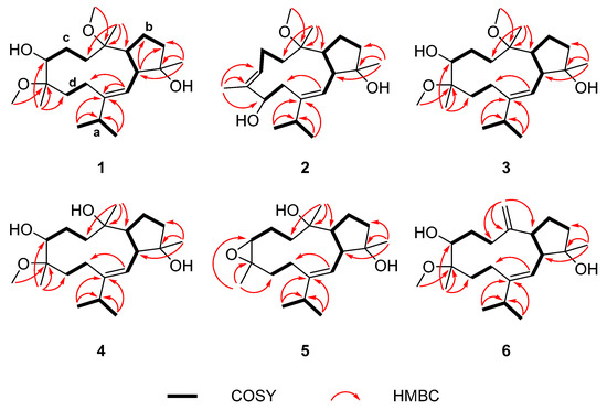 1H–1H COSY and key HMBC correlations of compounds 1–6.